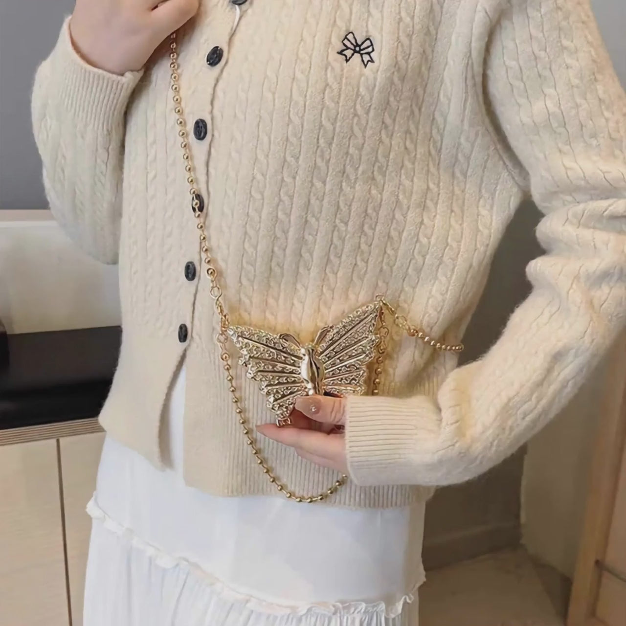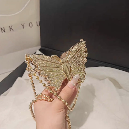 This elegant Butterfly-shaped mini clutch features a shiny acrylic Metallic finish paired with a luxurious golden chain, making it an impeccable accessory for any event or party. Compact at 3x3 inches, it seamlessly elevates your ensemble with a sophisticated touch, combining practicality with refined style.